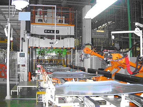 車門(men)包邊(bian)液壓(ya)機是為(wei)汽車制造(zao)廠(chang)開發的專用液壓(ya)機,具有速(su)度(du)快(kuai)、自(zi)動化程度(du)高、工作柔性(xing)化程度(du)⾼等特(te)點,廣泛應(ying)用於(yu)於(yu)汽車車門(men)的包(bao)邊(bian)工藝(yi)。本系(xi)列液壓(ya)機由主機和快(kuai)速(su)換(huan)模系(xi)統組(zu)成(cheng),快(kuai)速(su)換(huan)模系(xi)統采(cai)用(yong)具有自(zi)主知(zhi)識(shi)產權(quan)的移(yi)動(dong)工作臺模具置(zhi)換(huan)裝置(zhi),包(bao)括(kuo)多(duo)只移(yi)動(dong)⼯作臺的組合(he)、換(huan)模小(xiao)車(che)、儲(chu)模系(xi)統和(he)模(mo)具快(kuai)速(su)夾緊(jin)系(xi)統、控(kong)制系(xi)統。